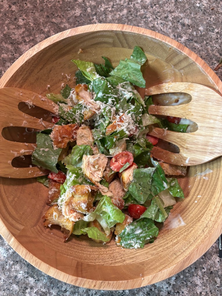 Pan fried chicken breast, home made croutons, fresh grated parm, romaine, cherry tomatoes